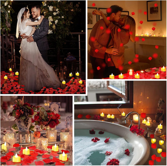 100 Pieces Artificial Rose Petal with 24 Pack Romantic Heart Led Candle Flameless Love Led Tealight Candle for Valentine's Day Gift Romantic Night Anniversary Table Decor (Warm White Light)
